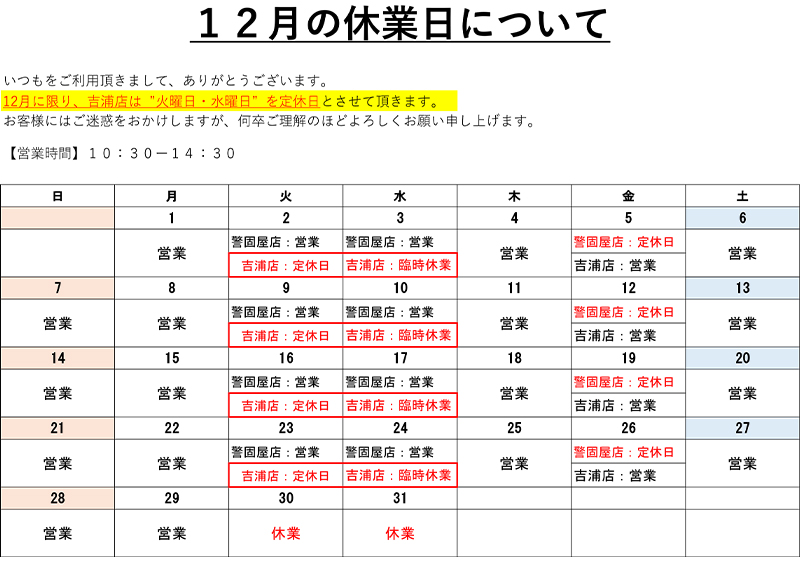 うどん屋だし道楽 12月営業日のご案内 2025年11月28日 admin-dashidouraku いつもご利⽤頂きまして、ありがとうございます。うどん屋だし道楽警固屋店、吉浦店の12月の営業⽇程をお知らせ致します。12月に限り、吉浦店は「火曜日・水曜日」を定休日とさせていただきます。詳細は下記のカレンダーでもご確認いただけます。